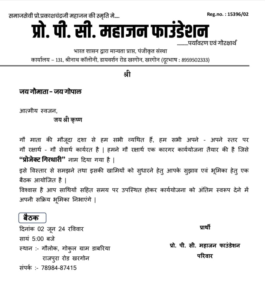 इस पत्र को मैं खरगोन के कलेक्टर श्री कर्मवीर जी शर्मा और खरगोन के एस पी श्री धर्मराज जी मीणा जी को भेज रहा हू की इस कम्पनी का इतिहास यह है ! *प्रोजेक्ट गिरधारी* के नाम से सरकारी शिक्षक रविशंकर महाजन अब कोई नया प्लान गरीब , किसान , मजदूर और छोटे व्यापारी को बताकर कोई ठगी नही करे क्युकी आज यह सरकारी शिक्षक खरबपति है , प्रकाश स्मृति कम्पनी , तंजीम ए जरखेज कम्पनी और प्रोफेसर पी सी फाउंडेशन कम्पनी की प्रापर्टी और जमीनें और नगदी आज अरबों , खरबों में है इसलिए इस नए प्रोजेक्ट पर प्रशासन , सरकार , मीडिया और सी आई डी विशेष नजर रखे !
