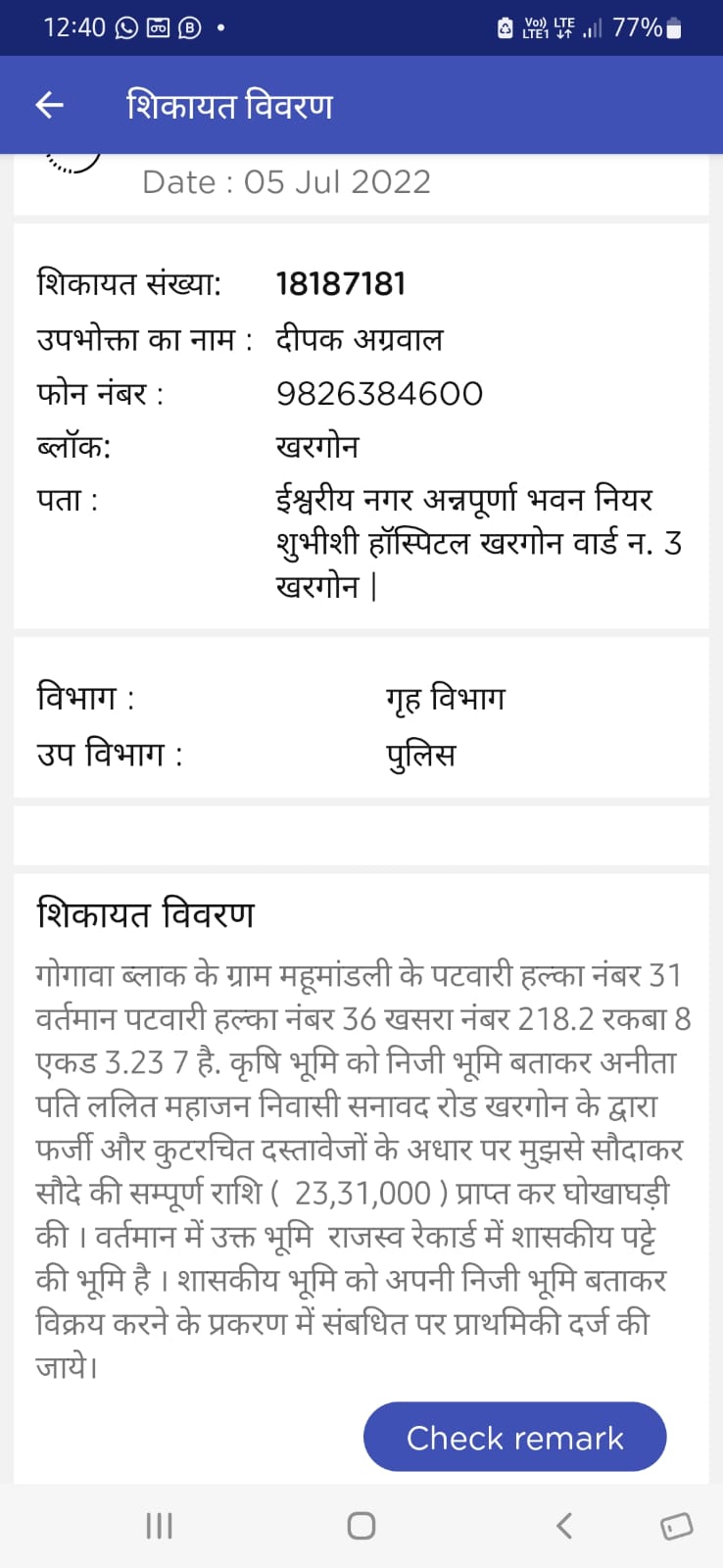 खरगोन के दीपक अग्रवाल भी इस जमीन को खरीदते है लाखो रुपए देते है किंतु जब उन्हें मालूम पड़ता है की यह जमीन तो सरकार की है तो वे एक अच्छे और ईमानदार नागरिक की भूमिका को निभाते है और मध्यप्रदेश की सी एम हेल्प लाइन में शिकायत कर देते है !